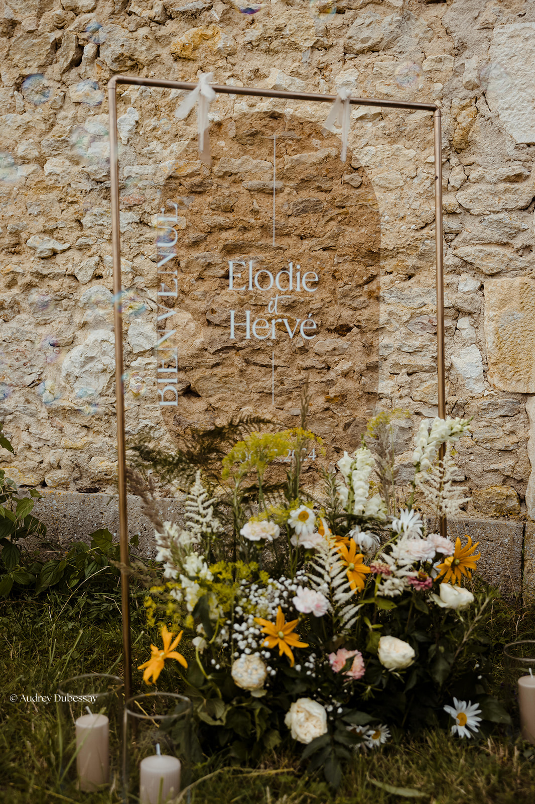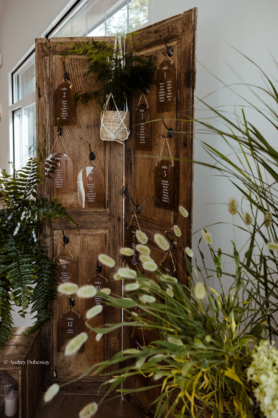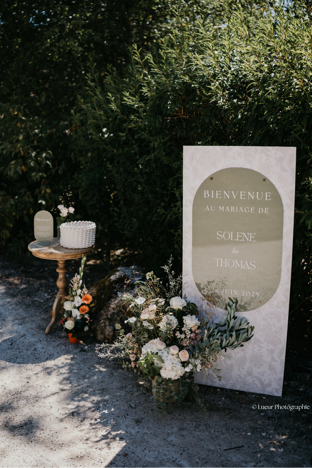 le panneau de bienvenue, le plan de table, la décoration des tables, ainsi que les espaces dédiés à l’urne et au livre d’or.